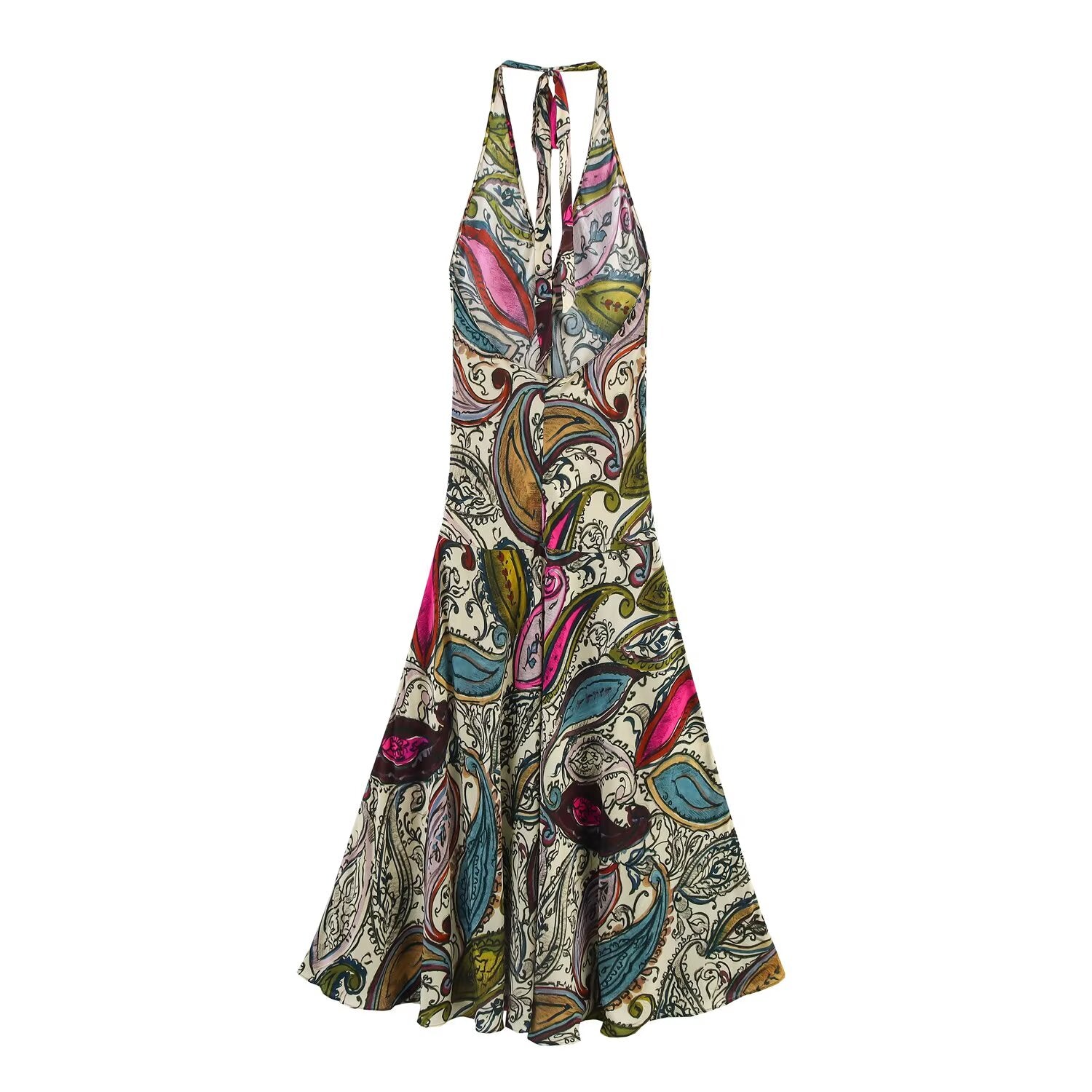 Women's new chic Fashion slim draped print hanging neck MIDI dress retro sleeveless backless women's dress
