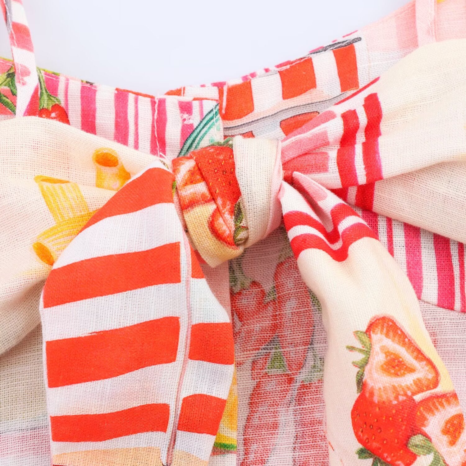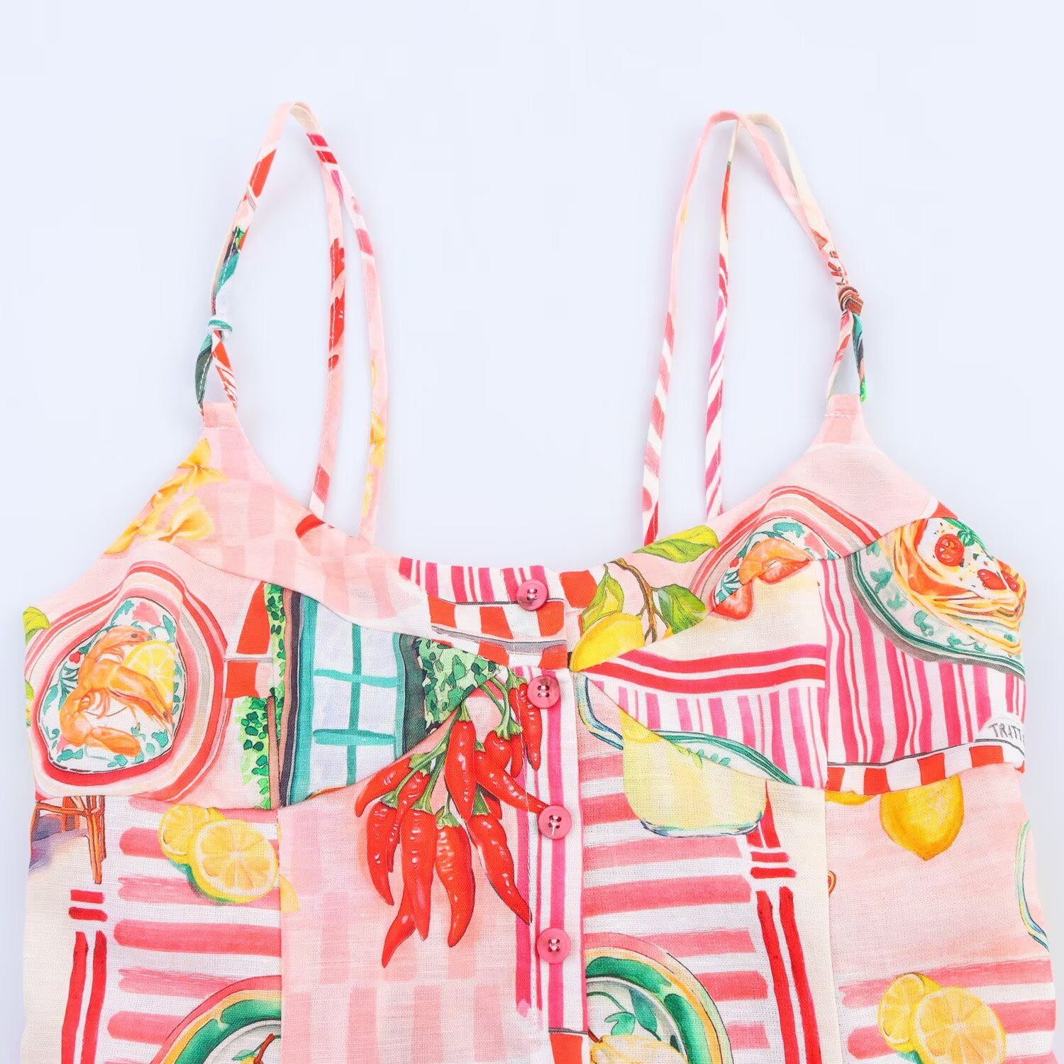 Women's New Fashion Linen Blended Patchwork Printed suspender Midi Dress