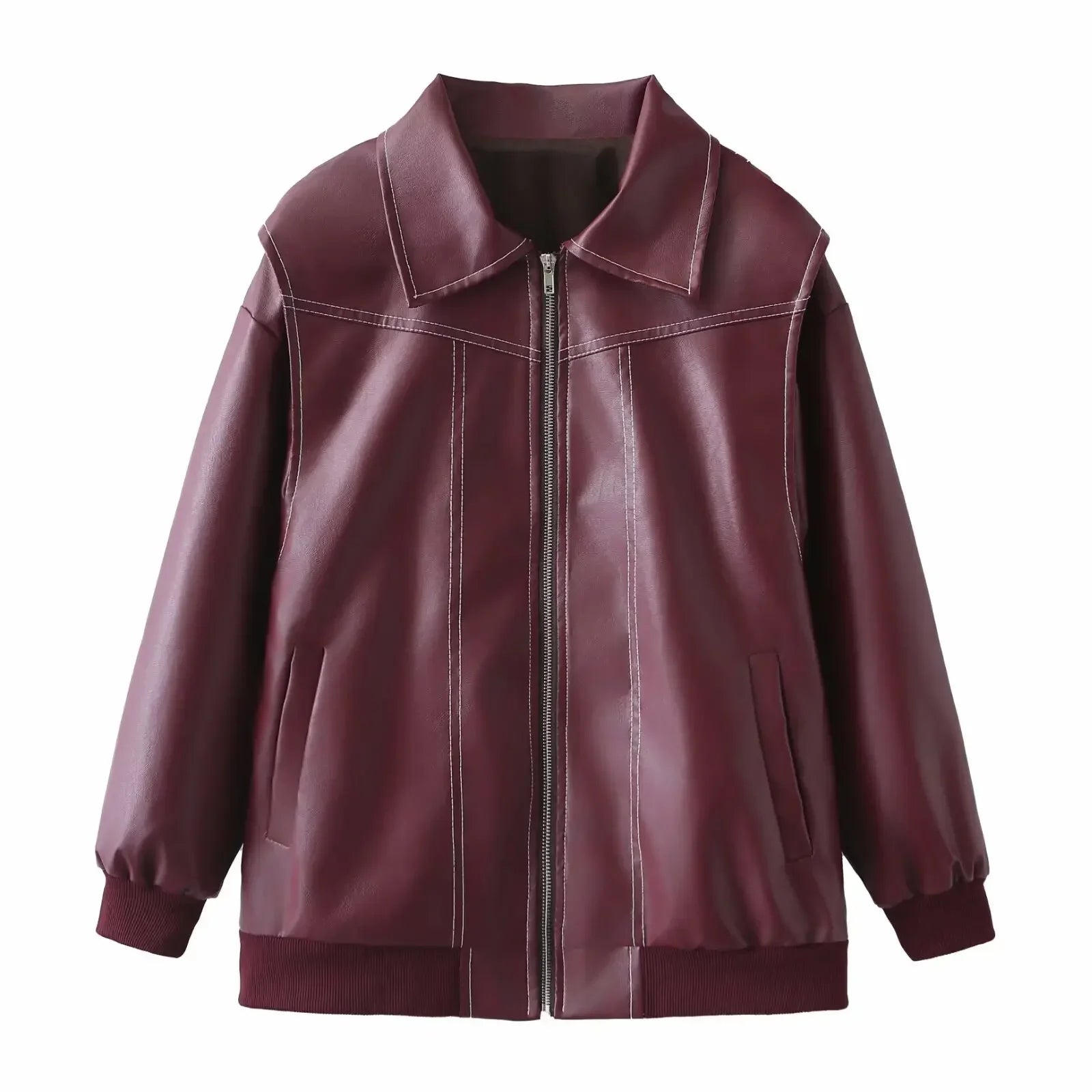 Women's new Fashion loose casual versatile retro imitation leather jacket coat long sleeved side pocket women's coat chic top