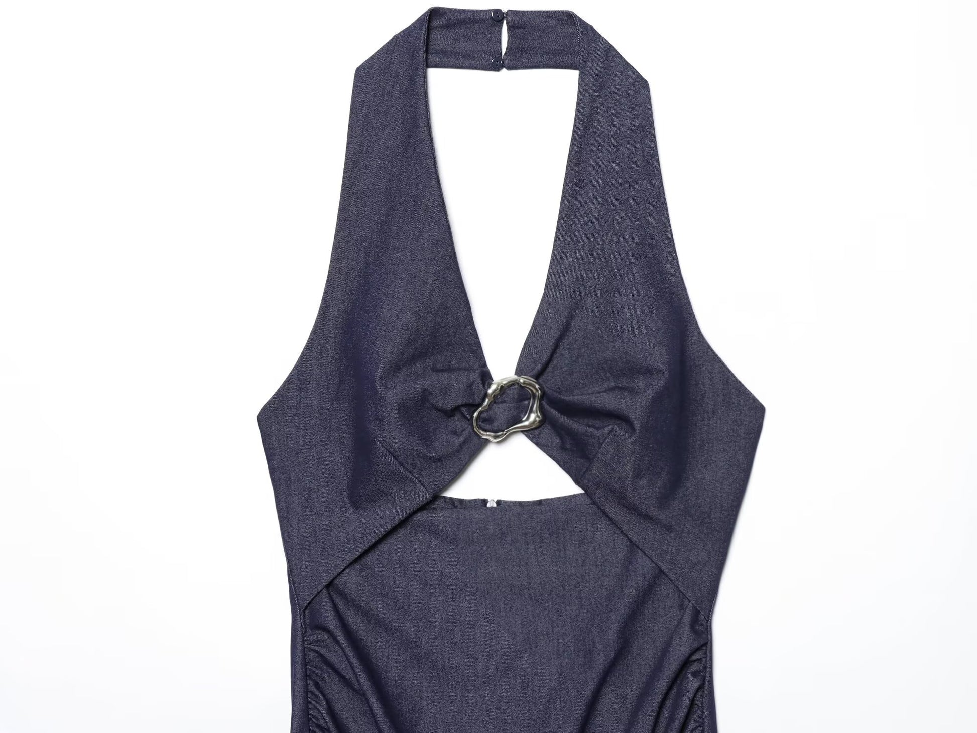 Women's New Fashion Open Design Tight Cowboy Hanging Neck Midi Dress