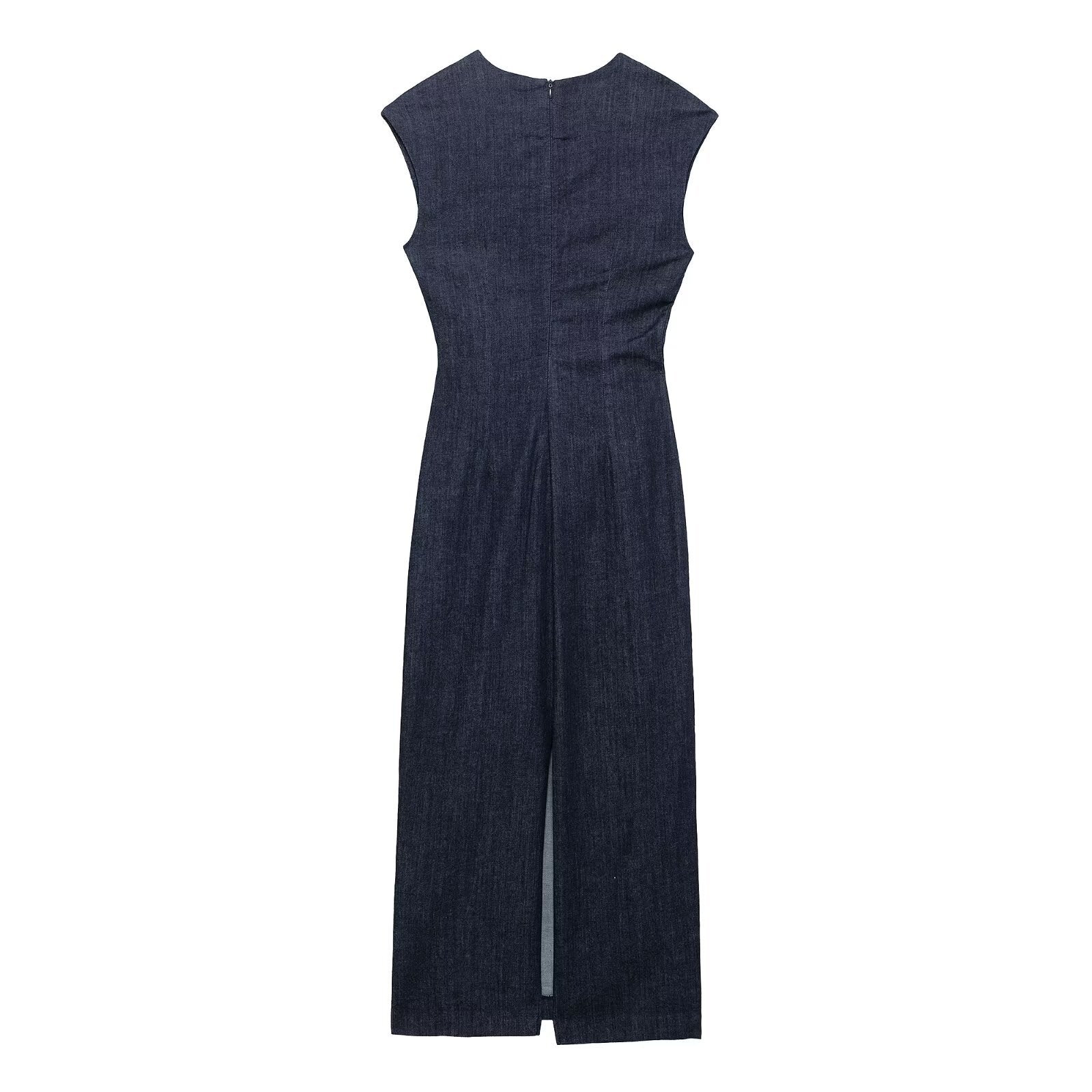 Women's new fashion pleated decoration sleeveless split denim Midi dress