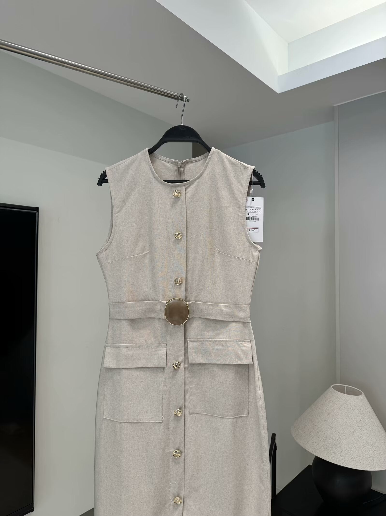 Women's New Fashion Sleeveless Single breasted Linen Blended Midi Dress