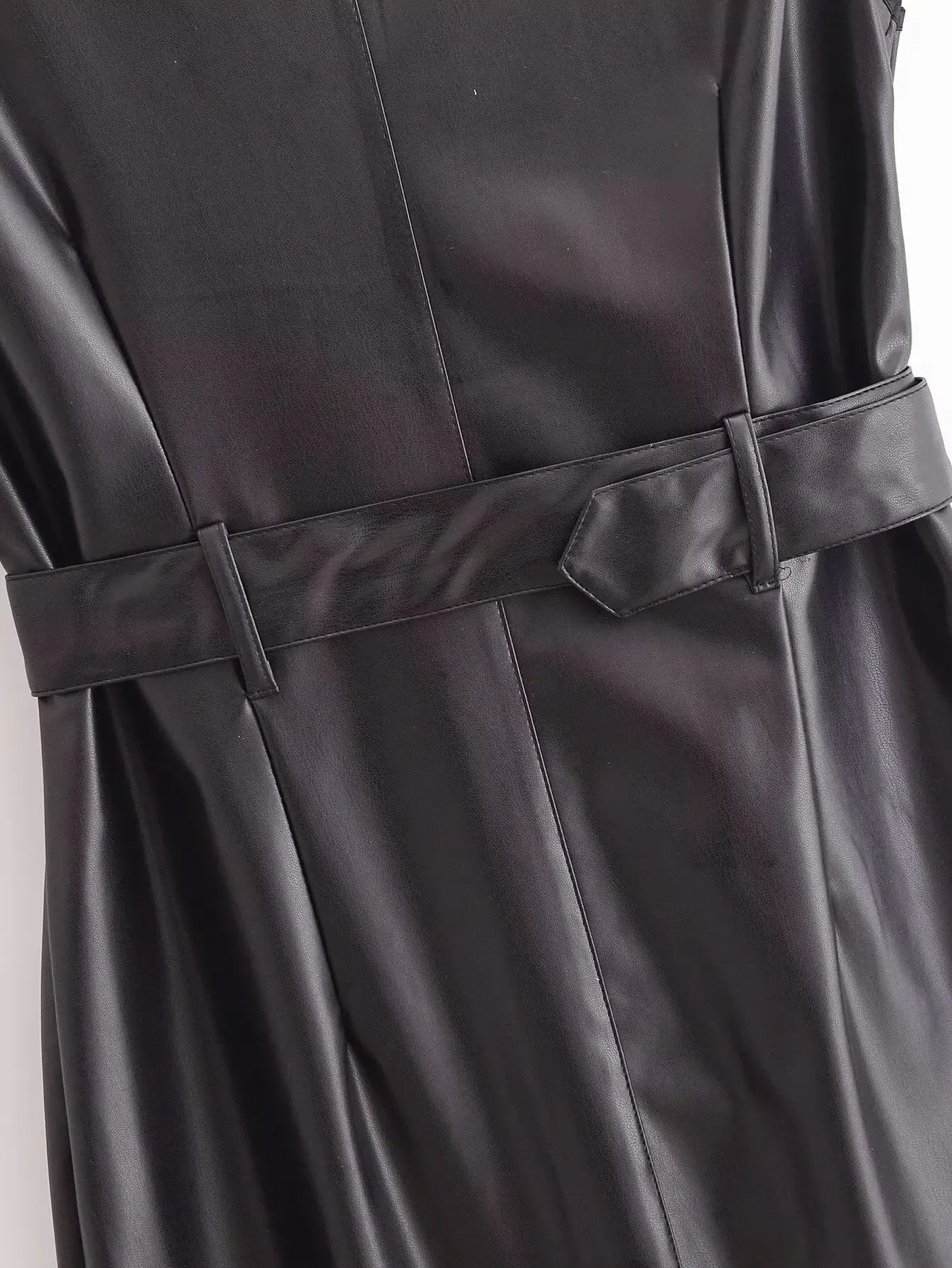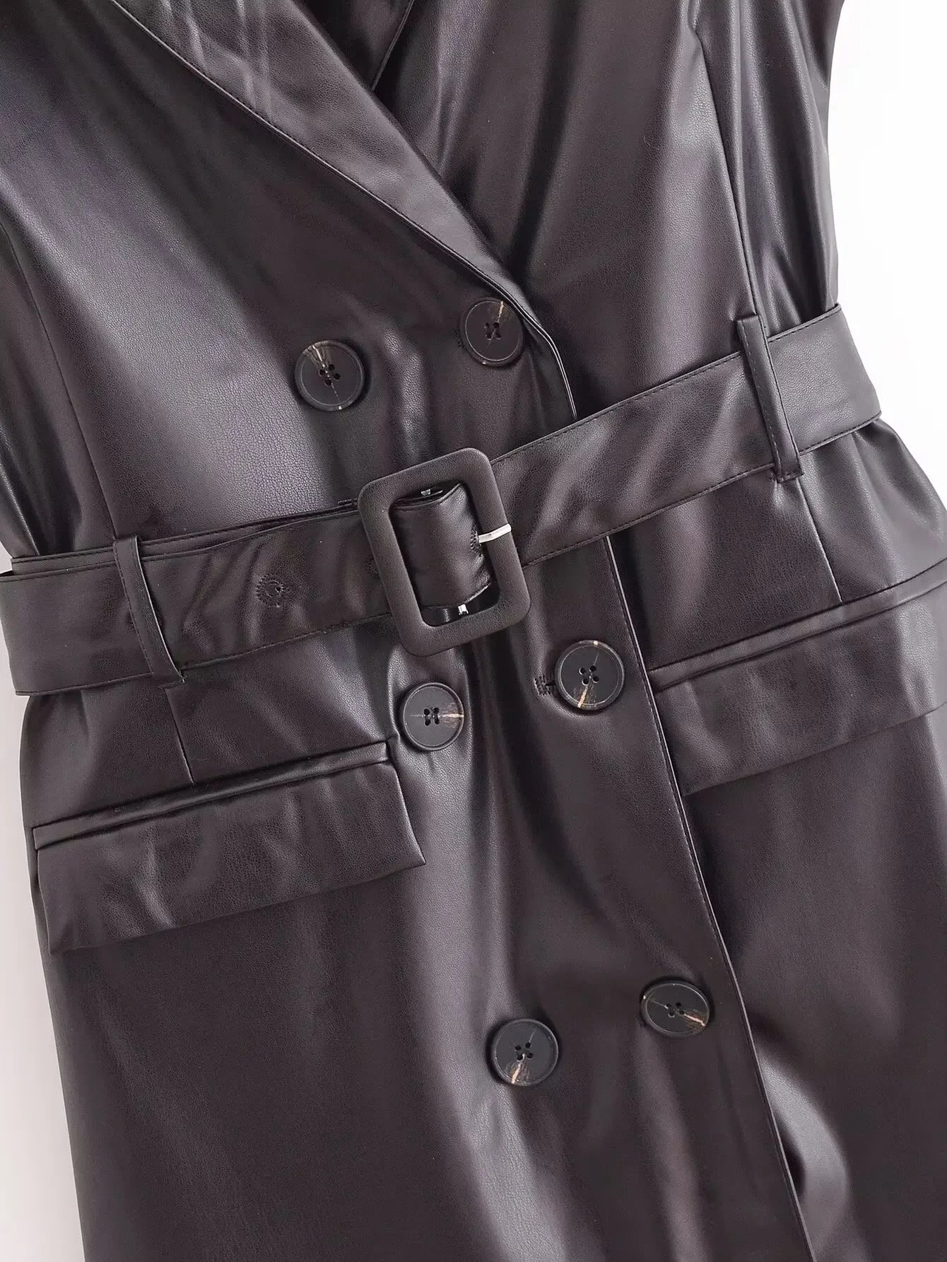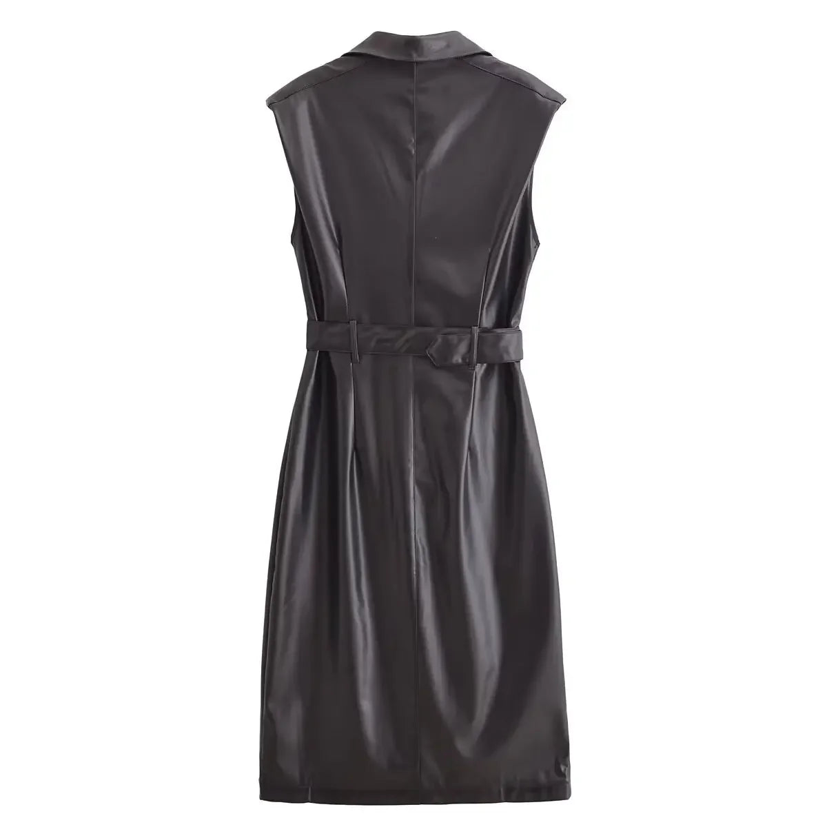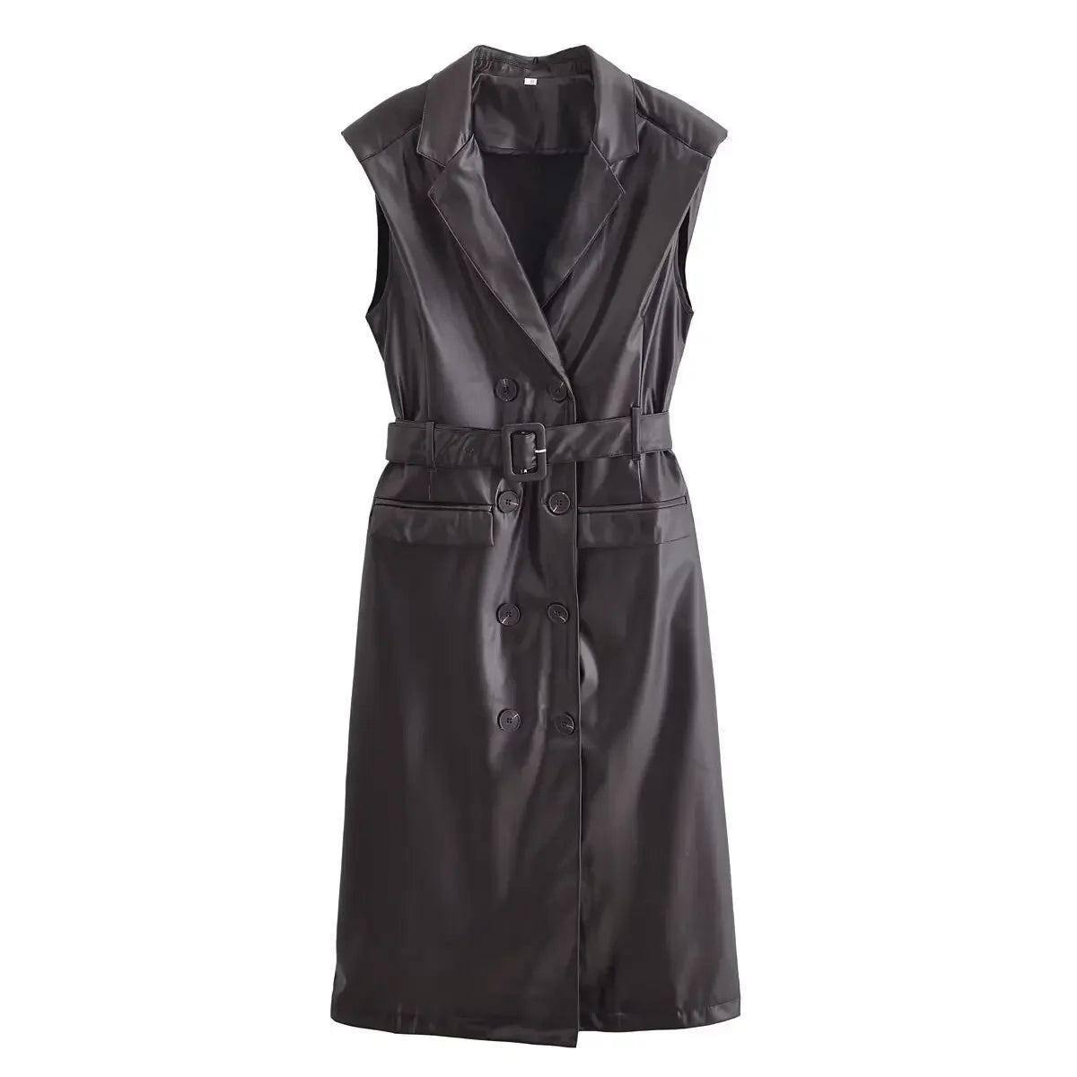 Women's New Fashion With Belt Black Windbreaker Style Double breasted Faux Leather Midi Dress Retro Sleeveless Women's Dress