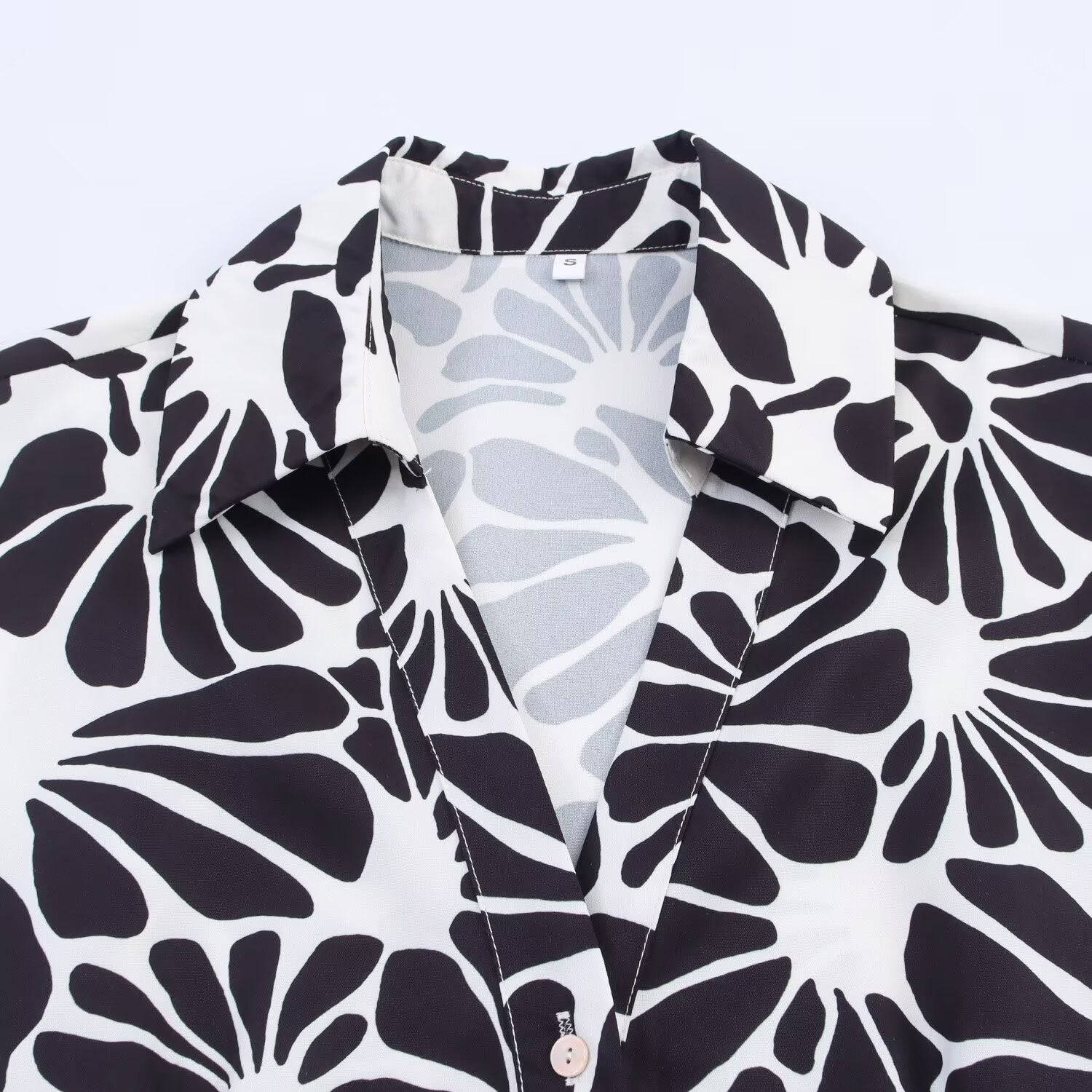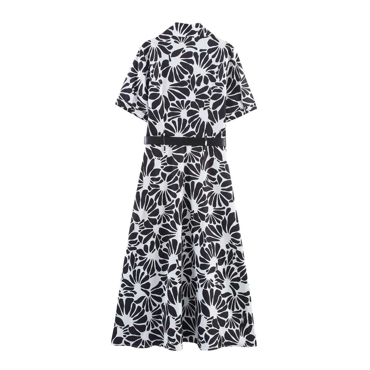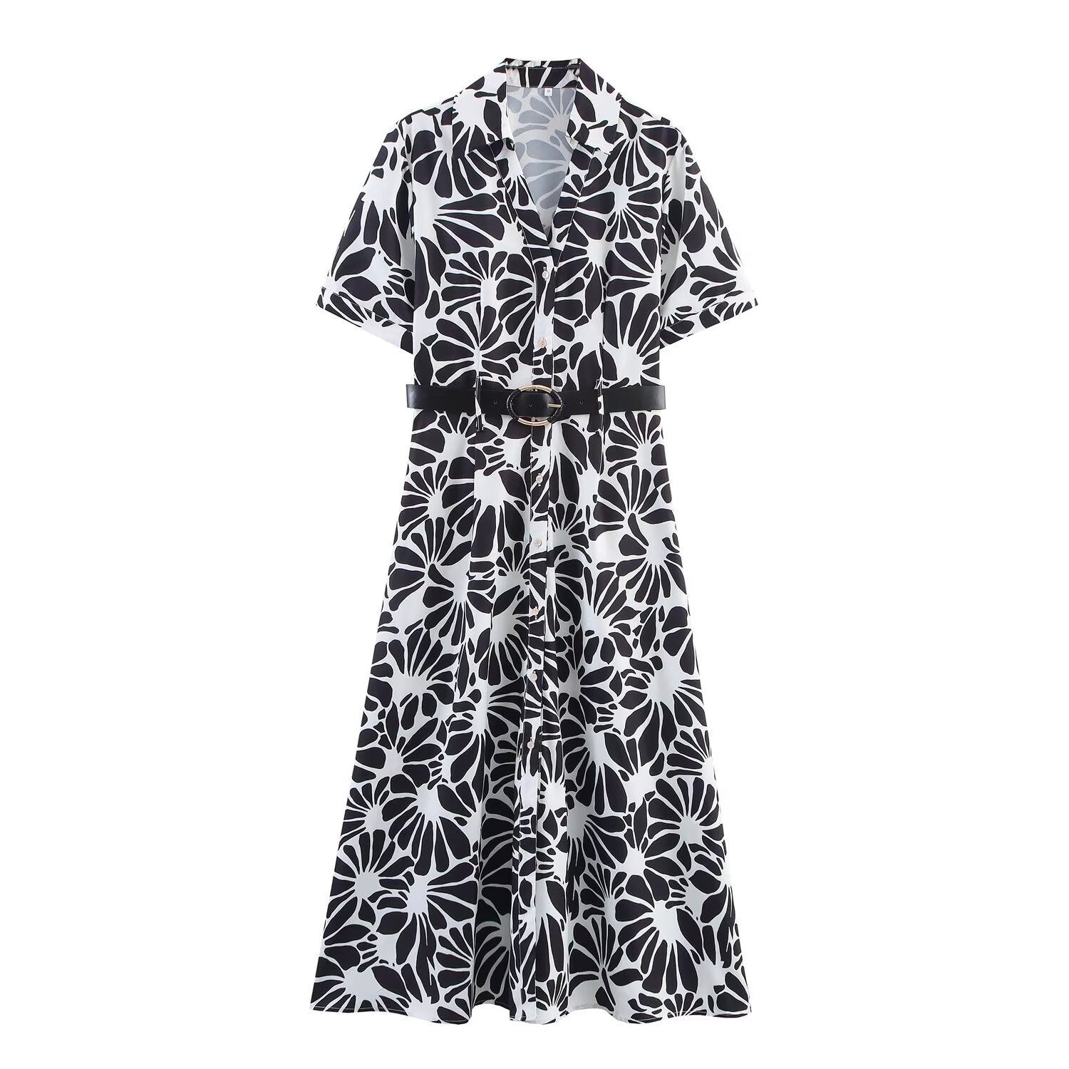 Women's New Fashion With Belt Short sleeved Printed Poplin Midi Dress