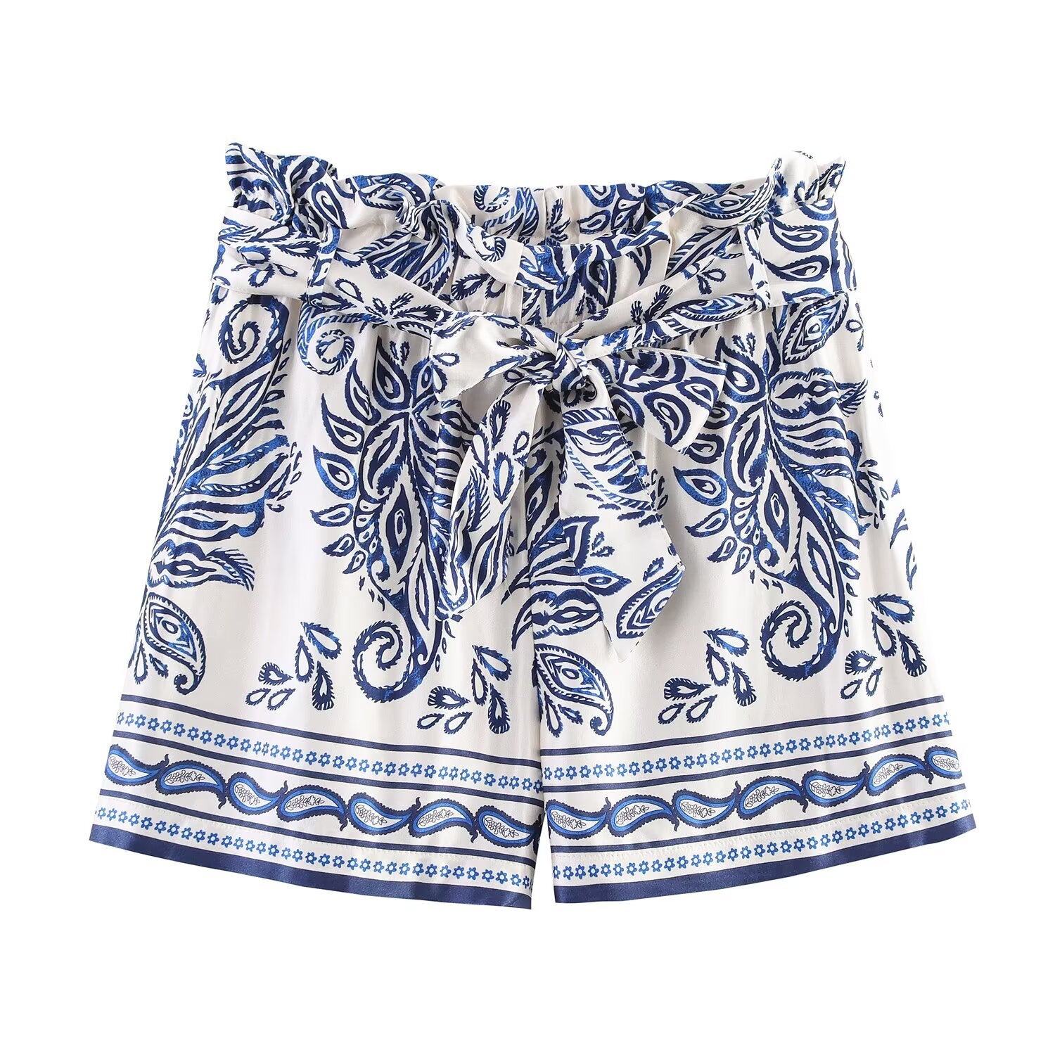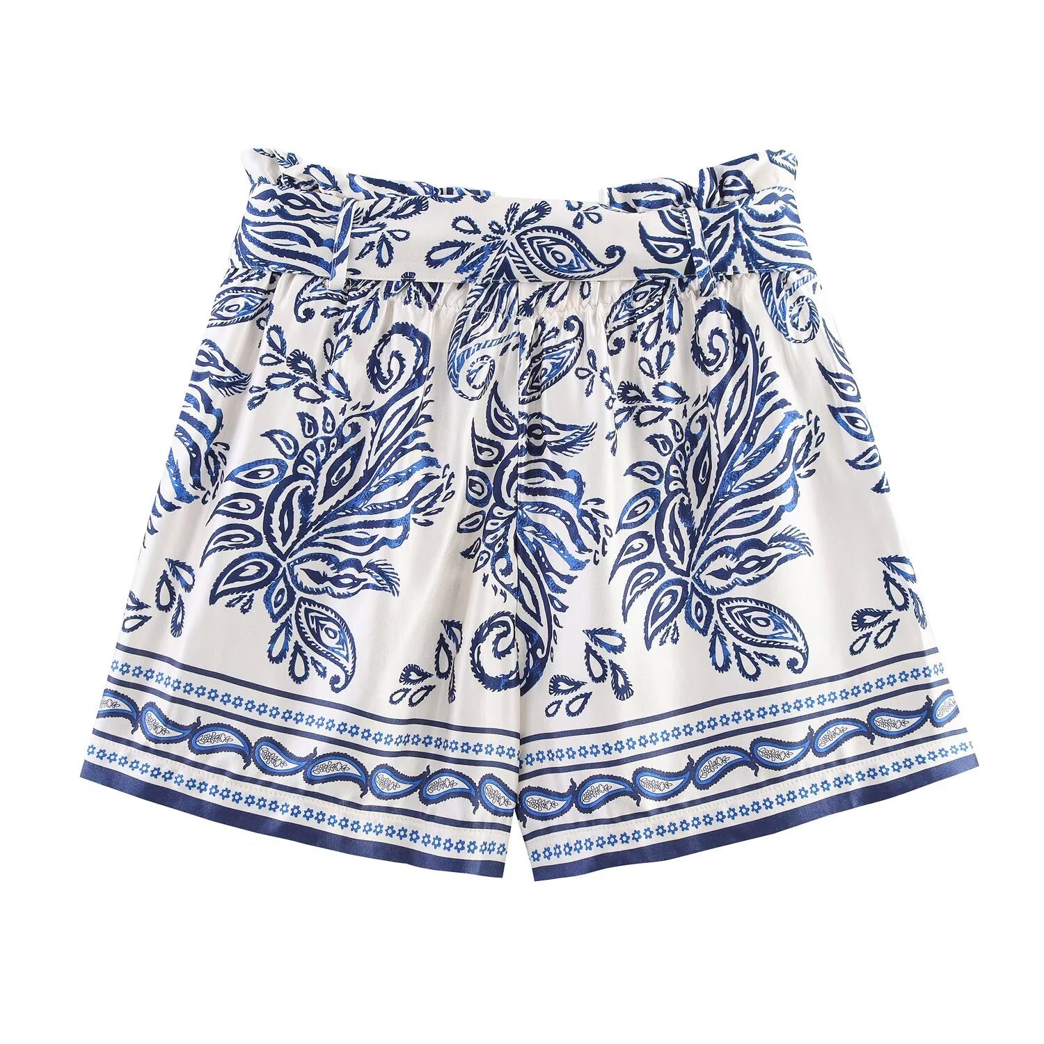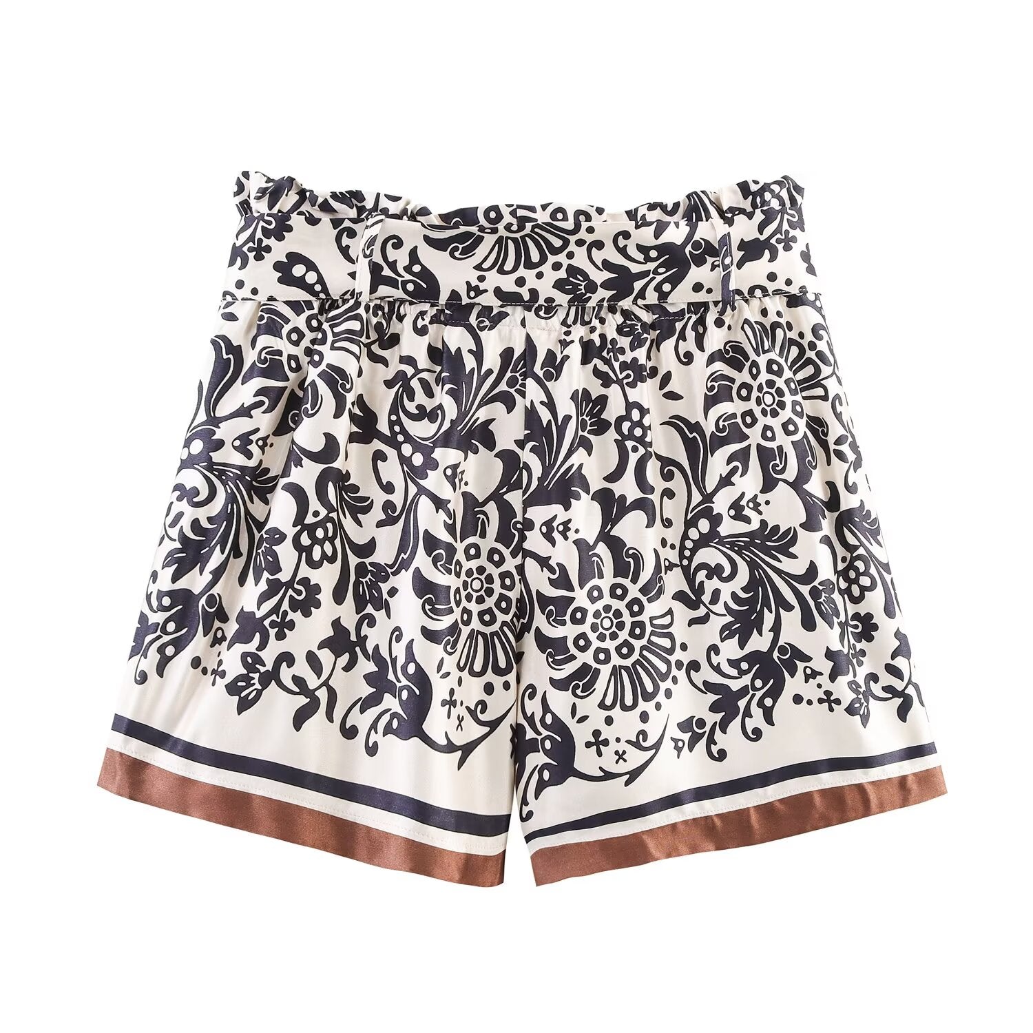 Women's New With Belt Satin Texture paper bag style printed shorts